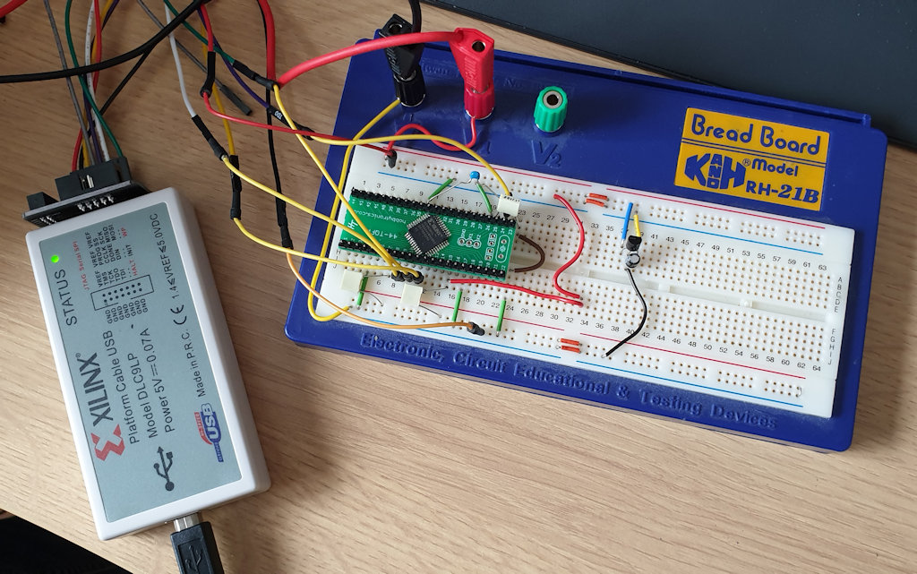 After a discussion with Phill Harvey-Smith, I ordered a Xilinx CPLD programmer, along with tutorial board and a few XC9536XL CPLDs and QFP-44-to-DIP-44 adaptor boards. The tutorial board was really, really basic, and I had the LED flashing in no time – and thus it was time to start developing my own ‘code’. I originally decided to use VHDL as my CPLD progamming language – paying for a discounted online course.