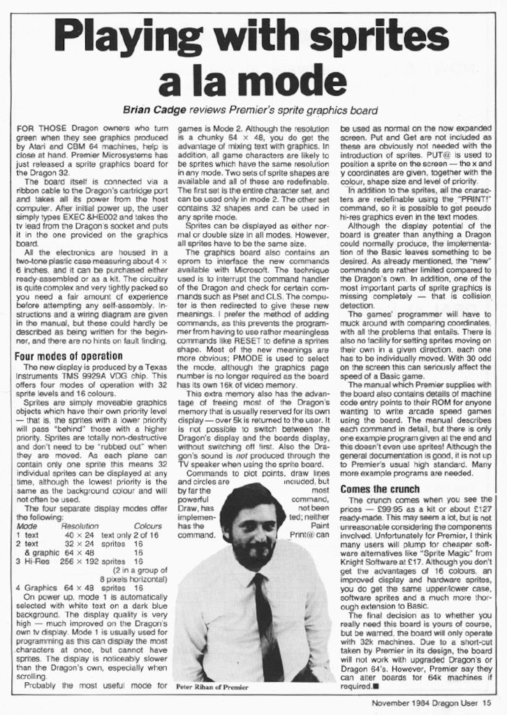 This story really starts with the Premier Sprite board, first mentioned on the World of Dragon forums back in January 2019. That board was developed by Premier Microsystems back in the 1980s for their UK101 computer system, and it was adapted to work with the Dragon 32. There were articles on the board in Dragon User and Personal Computer News.