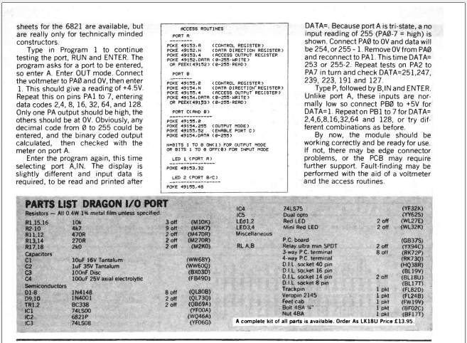 Back in the day, there was a relatively simple interface board, sold as a kit, by Maplin Electronics in the UK. It used a 6821 PIA to control several I/O ports on a cartridge interface board. I hankered after this board when I was younger, but had this habit of blowing my pocket money on sweets or Panini stickers or something else pointless. So I never got one.